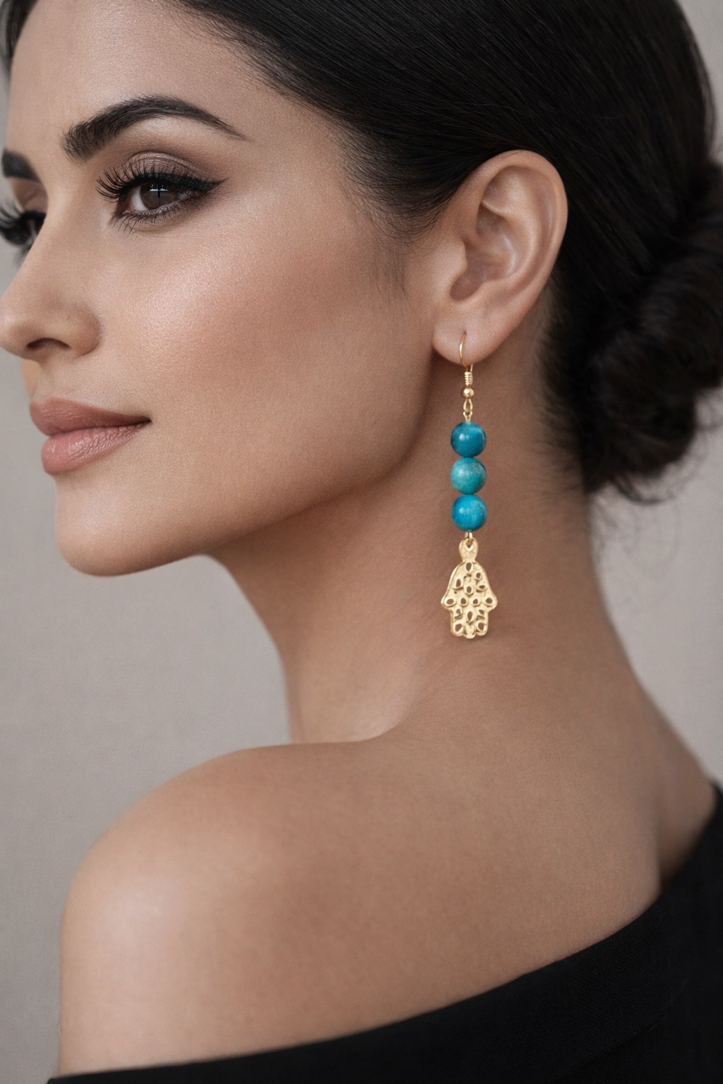 Elles se composent d’un pendentif en forme de main de Fatma, en cuivre plaqué or, et de perles en agate bleue, soigneusement sélectionnées pour leur éclat et leur énergie unique.