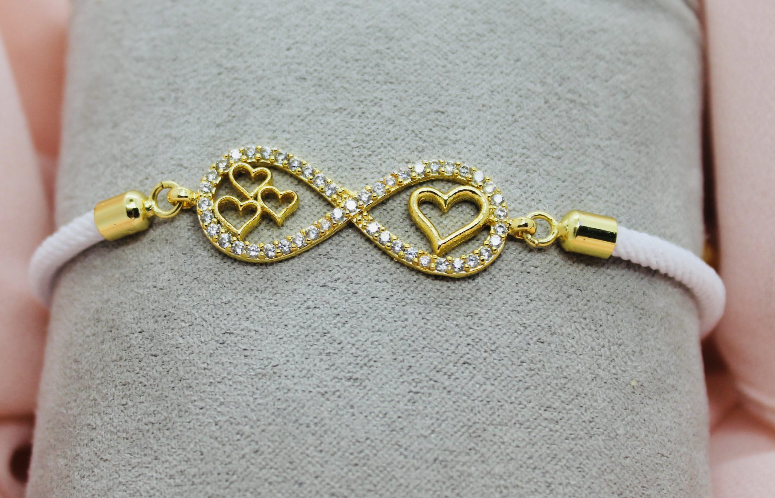 • Ce bracelet délicat est orné d’un pendentif en acier inoxydable en forme de symbole d’infini, serti de pierres étincelantes et rehaussé de cœurs dorés.