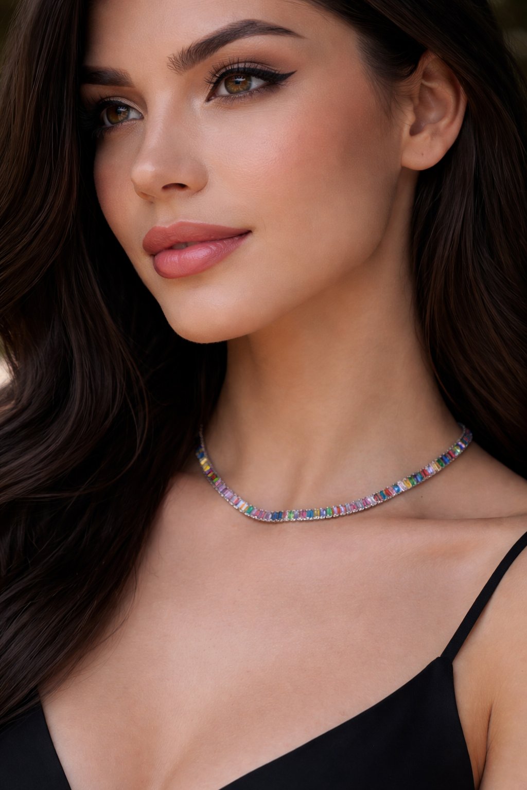 • Les pierres aux teintes vibrantes, allant des tons pastel aux nuances plus vives, créent un arc-en-ciel harmonieux qui attire le regard et illumine le cou.